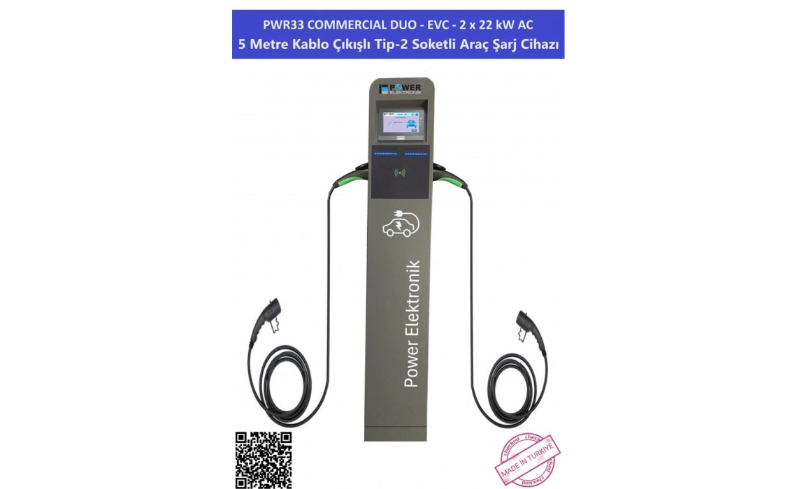 EVC-2x11 kW PWR33 Commercial Duo; ticari alanlarda aynı anda iki araca hizmet vermek için tasarlanmış, 2 x 11 kW AC güç sunan, OCPP 1.6J uyumlu çift çıkışlı şarj istasyonudur. 7” HMI ekran, RFID, Tak&Şarj Et ve MID enerji metre ile yönetilebilir bir şarj altyapısı kurmanıza yardımcı olur.